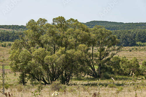 Landscape of summer nature with green glade, flower, forest and big White willow or Salix alba tree, Sredna Gora mountain, Ihtiman, Bulgaria