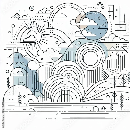 aesthetic, contour, landscape, nature, city, decoration, line, contour, sun, cloud, tree, water, mountain, colours, dynamic, symmetry, elegance, simplicity, space, inspiration, texture, morning, sunset, graphic, art, marketing, publication, portfolio, design, template, geometry, abstraction