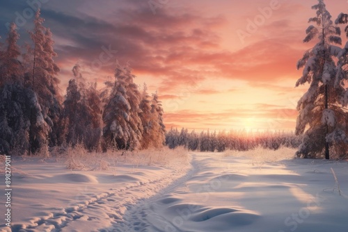 landscape, forest, sunset, snow, nature, winter, plant, tree, sky, outdoors, cloud, downloadable, background, beautiful, panoramic, mountain, scenery, sunrise, travel, photo, sun, holiday, digital artwork, pine tree, graphic, land, image, snowy, dawn, real, freezing, conifer, hi-res, realistic, panorama, twilight, timberland, glacé, hd, idylli