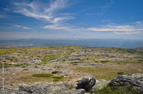 Landscape, space in the mountains with rocks and yellow grass