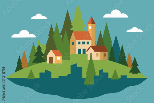 landscape, house, village, illustration, vector, tree, home, sky, nature, cartoon, summer, building, town, green, city, cloud, grass, castle, architecture, mountain, spring, farm, hill, sun, country