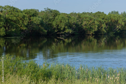 Landscape, view of the lake and the shore, green trees and water surface