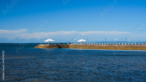 Landscape with blue sky, blue sea, and people on pier with white rails and white roofed shelters