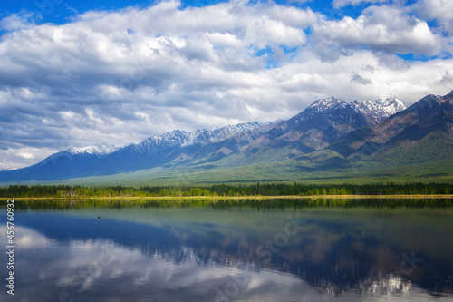 Landscape with mountains reflecting in the water on sunny day. Buryatia, Tunkinskaya valley