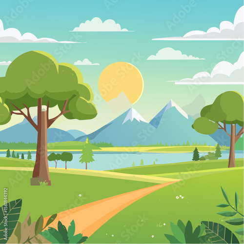 landscape, sky, nature, summer, grass, vector, tree, spring, cloud, field, illustration, sun, hill, green, cartoon, meadow, cloud, flower, countryside, day, hill, rural, forest, mountain, design