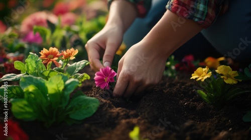 Landscaper planting flowers in a garden bed. Featuring attention to detail and color