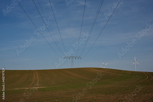 field, windmill, wind turbine, energy, winter, hill, heaven, blue, green, horizon, pylon, german