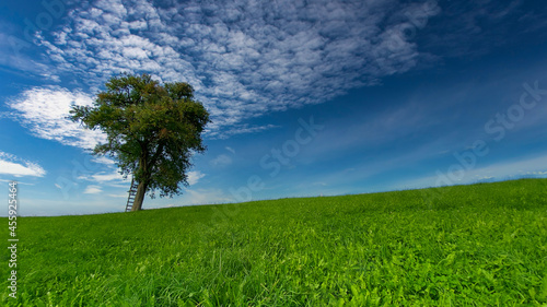 Landschaftsaufnahme einer saftigen grünen Wiese mit einem Apfelbaum an welchen eine Leiter angelehnt ist unter blauen Himmel mit Wolken