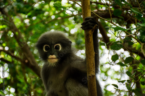 animal, ape, asia, baby, black, tree branch, closeup, cute, dusky, expression, eye, family, forest, fur, glance, gold, green, grey, hair, hairy, head, jungle, langur, little, look, mammal, monkey, mother, national, nature, park, portrait, primate, sitting, bespectacled, siam, thinking, tree, tropical, wild, wilderness, wildlife, young