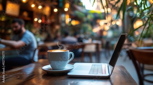 Laptop and a cup of coffee on the table in a cozy cafe.