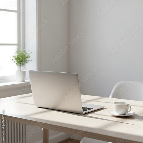 Laptop and coffee cup on a bright wooden table in a minimalist home office with natural light.