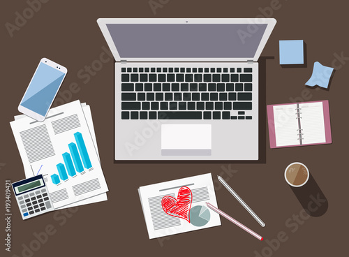 laptop, phone, smartphone, blue, grey, vector, illustration, office supply, desk, countertop, red, table, note, paper, white, pink, leaf, graph, chart, segment, circle, pen, drawing, nubes, love, work, office, rest, break, hot drink, cocoa, lunch