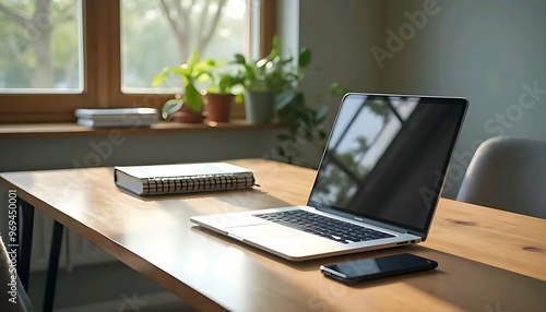 laptop, computer, phone, smartphone, desk, table, wooden table, wood, office, home office, workplace, work area, modern, clean, minimal, simple, elegant, stylish, technology, digital, contraption, device, productivity, business, professional, entrepreneur, freelancer, startup, office supply, notebook, notepad, paper, pen, crayons, sunlight, light, shadow, window, view, green, plant, room, interior, design, home