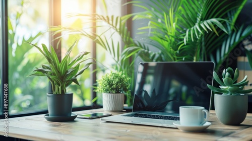 laptop, desk, plant, office, workspace, home, computer, work, green, nature, indoor, technology, productivity, supply, leaf, workplace, modern, interior, minimalism, space, notebook, screen, keyboard, mouse, cup, hot drink, tea, lamp, chair, window, sunlight, natural, light, design, style, lifestyle, minimal