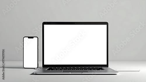 Laptop and smartphone, both with blank screens, set against a light background. Ideal for technology mockups, digital design, and marketing materials.