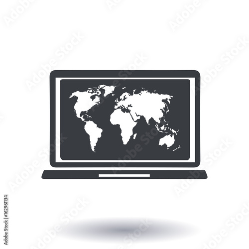 Laptop and world map illustration. World map geography symbol. Flat design style.