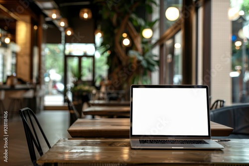 Laptop Computer on Wooden Table in Cafe Setting