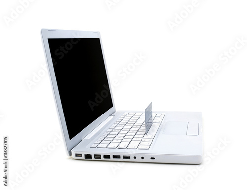 Laptop computer with a credit card.