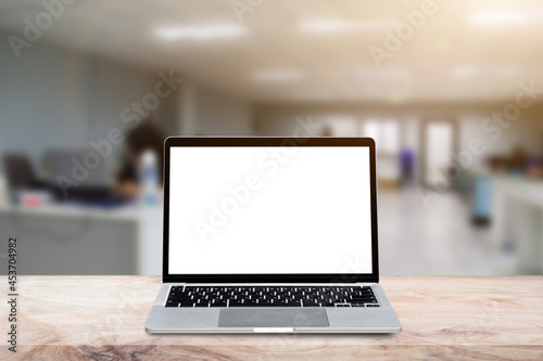 Laptop computer with blank screen on wood table over blur background. Mock up, template for your design.