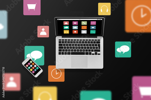 laptop, computer, smartphone, media, application, multimedia, technology, menu, icon, interface, symbol, app, electronic, modern, notebook, phone, thing, stuff, supply, concept, cyberspace, online, contraption, mobile phone, mobile, mobile phone, still life, nobody, object, layout, black, business, screen, display, communication, connection, equipment, background, dark, futuristic, future, topview