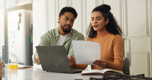 Laptop, documents and research with couple in kitchen for bills, home loan and financial planning. Online banking, paperwork and budget review with man and woman reading in house for application