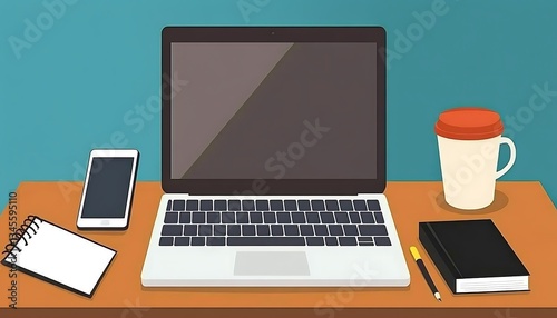 laptop, computer, notebook, phone, smartphone, desk, workspace, office, work, business, technology, digital, modern, design, background, flat, illustration, graphic, clean, minimal, simple, hot drink, mug, pen, notepad, stationery, productivity, efficiency, planning, strategy, organisation, teamwork, communication, cyberspace, online, connection, home office, study, learning