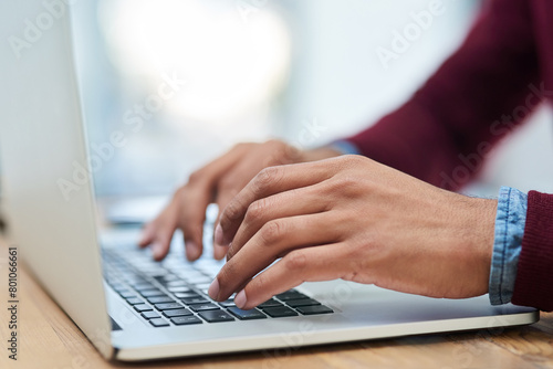 Laptop, hands and business person typing email for project, blog or writing article on desk in startup. Computer, closeup and professional on keyboard at table for creative copywriting on internet