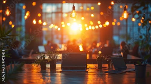 laptop, table, wooden, cafes, sunset, window, string, light, plant, desk, work, computer, orange, yellow, gold, warm, cosy, light, dark, interior, design, modern, rustic, hot drink, tea, keyboard, screen, open, technology, office, home, style, atmosphere, business, background