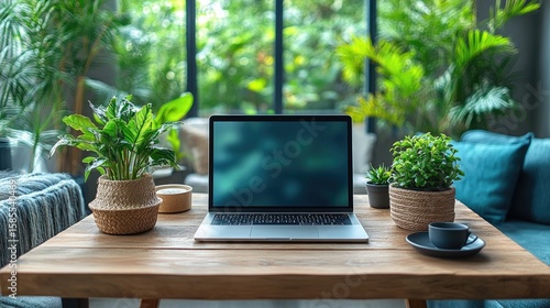 Laptop on a wooden table in a room with lush green plants creating a natural workspace atmosphere