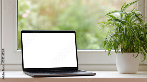 laptop, window sill, natural light, green plant, home office, productivity, white background, home decor