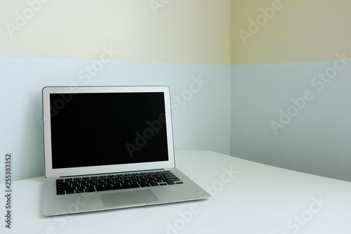 Laptop on white table top modern home office desk workspace on pale blue and yellow pastel color background with empty copy space. Creative, freelance and minimal office. Retro interior design.