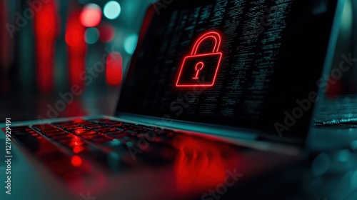 Laptop screen displays a red padlock, code visible. Illustrates cybersecurity, data protection, and online safety.