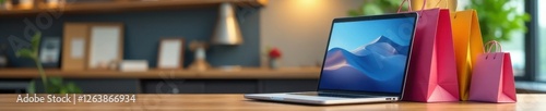 Laptop sitting on a table next to a box of products and shopping bags, e-commerce, online shopping, grocery shopping