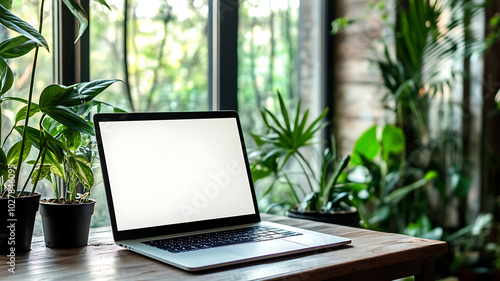 Laptop with a blank screen on a neat desk in a sunlit home office, with lush green plants and soft furniture in the background.
