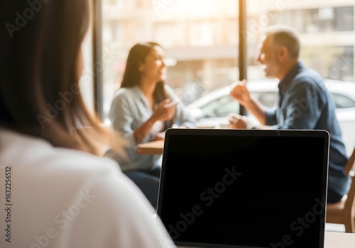 laptop, blank screen, cafes, blurred background, work, person, cafes, digital, technology, workspace, computer, screen, table, indoor, sunlight, day, lifestyle, business, meeting, communication, copy space, modern, casual attire, sharpened, talking, bright
