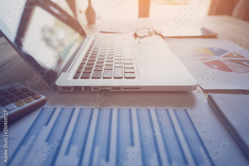 Laptop with financial documents on wooden table