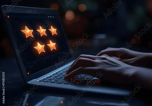 laptop, computer, screen, star, rating, review, feedback, quality, online, digital, technology, device, cyberspace, web, network, user, client, service, business, commerce, e-business, product, evaluation, assessment, satisfaction, life events, positive, negative, excellent, good, bad, keyboard, typing, hand, finger, dark, night, background, blur, sharpened, light, glow, desktop, working, work, home, office