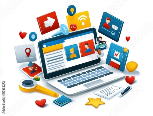 laptop, computer, cyberspace, online, communication, network, connection, technology, digital, web, website, icon, design, graphic, illustration, three-dimensional, modern, colourful, vibrant, marketing, business, networking, media, platform, content, strategy, engagement, interaction, global, innovation, growth, success, love, heart, location, wi-fi, profile, user, notification, datum, information, app, application, mobile