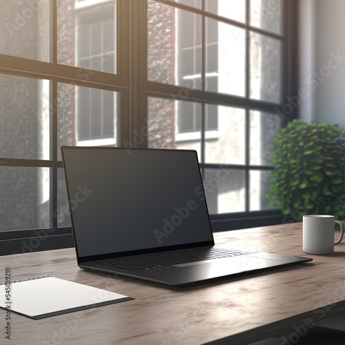 Laptop with the blank screen on the office table. Loft style 3d rendering
