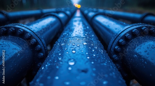 Large blue industrial pipelines on a misty morning reflecting droplets of water, showcasing a robust infrastructure in an outdoor setting