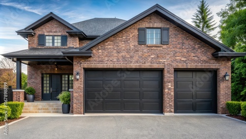Large brick house with black garage door, brick, house, garage, black, home, architecture, exterior, residential