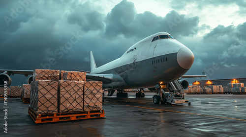 Large cargo plane on tarmac with stacked pallets under cloudy sky