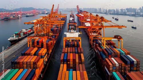 large cargo port in busy city, showcasing numerous shipping containers and cranes, reflects bustling activity of maritime trade. vibrant colors of containers create striking visual