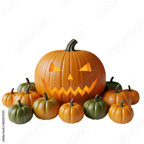 Large carved Halloween pumpkin with glowing face surrounded by smaller pumpkins isolated on a transparent background png, cut out, clipping path, social media, Advertisement, high quality, HD photo.