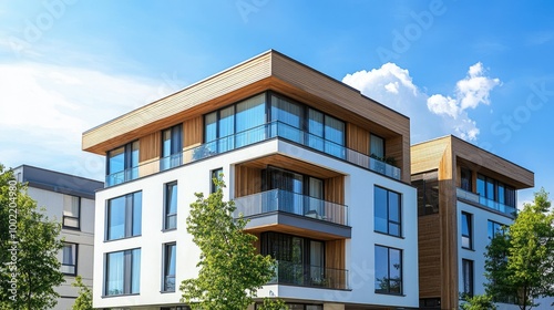 Large city house with modern design, leaving ample space for text in the clear sky.
