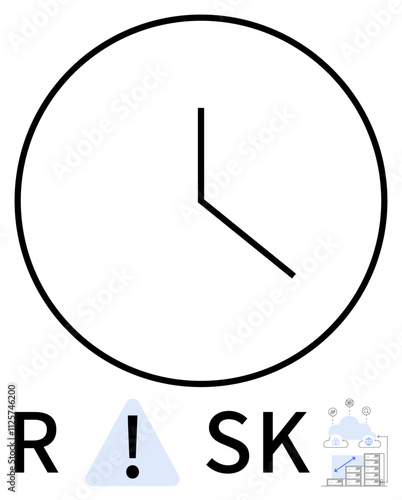 Large clock indicating time next to the word RISK. Warning sign and cloud with graphs suggest risk management, decision-making, and time sensitivity. Ideal for business, finance, project management