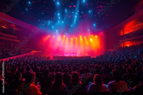 concert, venue, stage, light, crowd, audience, show, performance, event, music, entertainment, red, blue, dark, illumination, spectacular, vibrant, energy, atmosphere, live, people, seat, auditorium, amphitheatre, spectator, gathering, indoor, arena