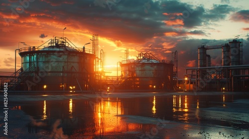 ai, oil, storage, tank, industrial, refinery, sunset, glowing, light, pipe, infrastructure, energy, fuel, large, cylinder, metal, industry, production, crude oil, facility, processing, twilight, orange sky, dramatic, engineering, operation, environmental, energy production, petrochemical, evening