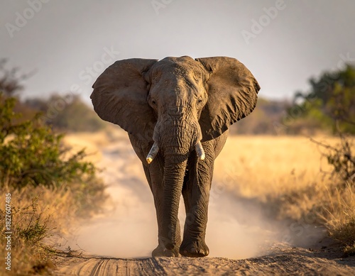elephant, africa, nature, wildlife, mammal, animal, tusk, trunk, ear, dust, path, dirt, outdoors, travel, journey, wild, large, powerful, face, close, ground, beige, dry, sunny, gold, light, skin, texture, wrinkle, eye, detail, grass, savanna, habitat, bush, leaf, creature, beast, huge, walking, front, majestic