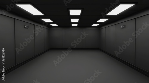 Large, empty room with no furniture or people. The walls are painted black and the floor is grey. The room is illuminated by overhead lights, creating a stark and stark atmosphere